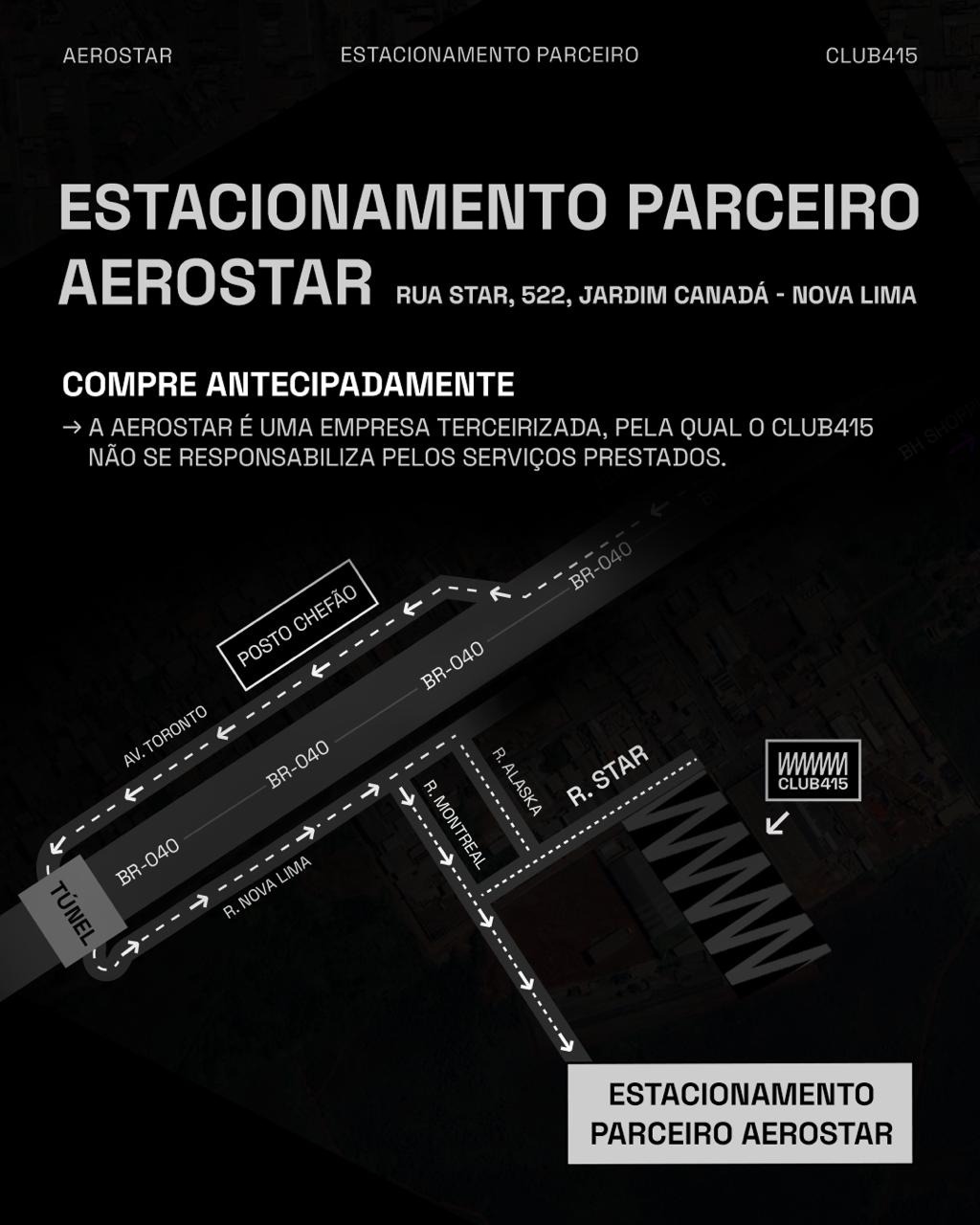Como chegar ao Club415 R. Star, 415 - Jardim Canada Nova Lima/MG - 34007-666 Google maps Waze Estacionamento parceiro A Aerostar é uma empresa terceirizada, pela qual o Club415 não se responsabiliza pelos serviços prestados. Garanta a sua vaga comprando antecipadamente pelo site: mais rápido e confortável. Confira os benefícios do serviço de estacionamento parceiro Aerostar: ✧ Segurança ✧ Iluminação ✧ Profissionais especializados ✧ Próximo ao evento Resevar vaga SIGA O CLUB415 Fique por dentro das novidades do novo Club415 @club_415